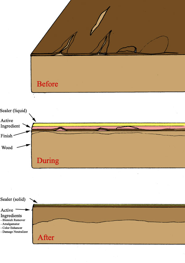 Reduces the appearance of scratches by reactivating and smoothing the existing finish. Certain ingredients penetrate to reamalgamate a dehydrated finish, and leaves a protective membrane even after wiping dry to the touch. Since Wood Elixir penetrates, strengthens and seals the original finish, the results are long-lasting (see photo above). |